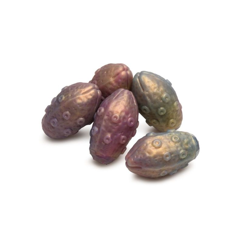 It's time to get bred by alien visitors. This thick, textured shaft from Creature Cocks is one of the most colorful yet with a mix of rich, vibrant, iridescent colors with shades of pink, green, orange and purple. The shaft itself is large and thick with tiny bumps on the head, ribbed texture along the opposite side, and a mixture of textures along the rod down to the wide, suction cup base. It can be used hands-free with the assistance of the suction cup or combined with a compatible harness for penetrating strapon play or pegging! Insert any or all of the four larva eggs into the hollow sheath and then insert them into your hole, letting the ovipositor deposit those eggs to be birthed out of you later after you're full! Made out of flexible, super soft, premium silicone both the dildo and the eggs are phthalate-free, body-safe, and best used with water-based lubricants only. To clean after, use warm water and mild soap then spray with a toy cleaner before patting dry