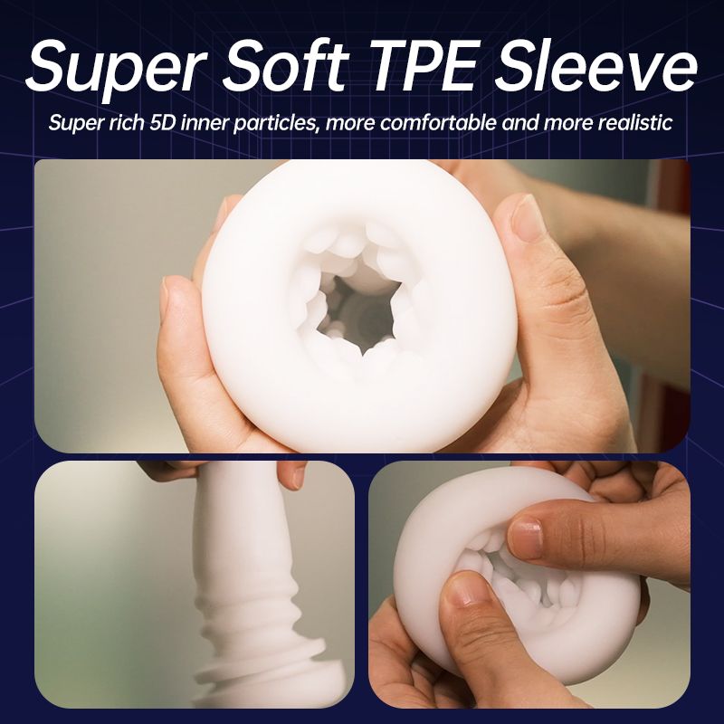 Matt grey and white stylish USB rechargeable full length insertable thrusting and vibrating masturbator from Drywell with white TPE stimulation sleeve.