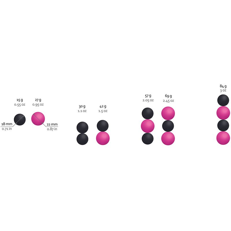 Geisha balls Magnetic are simple and clear to use. The package contains 4 balls of different weight. The set consists of two pink balls 27 g / 0.95 oz; and two black balls 15 g / 0.55 oz. The core idea of the exercise is to start with one black ball on a silicone string and then gradually increase the weight by magnetizing 1 ball at a time. It is the same you do during your workout at the gym. Geisha Balls Magnetic allows to do 7 levels of workout – from 15 g /0.55 oz to 84 g/ 3 oz. After this experienced users will work out only with the balls without a string. Besides being completely consistent with the human anatomy, Geisha balls² are safe for your body — they are made of 100% soft medical silicone. The balls have 1 year of warranty.