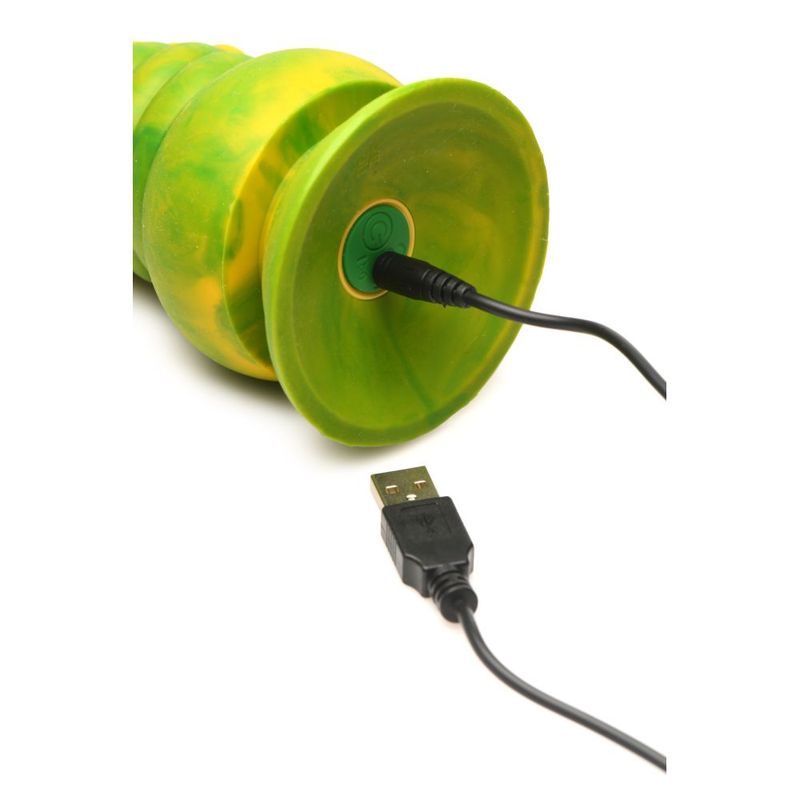 Enjoy your favorite Creature Cocks dildo with this vibrating Monstropus Tentacle! This yellow and green tentacle is massive and thick. The tapered tip helps with insertion, but from there on you can enjoy deep stretching as you fill yourself up with this firm yet squishy rod! Covered in suckers, this uniquely textured shaft stimulates you in new and spectacular ways! To add to the sensations, there's a powerful vibrator inside of the toy that packs 3 speeds and 7 patterns of vibration! Take this monster tentacle inside of you while enjoying the deep, powerful, rumbling vibrations! This toy is perfect for solo play and has a strong, suction-cup base for hands-free riding! Combine it with a compatible strap-on harness and enjoy some serious pegging fun! Indulge in any kinky cosplay, fantasy roleplay, or deviant desire, and rest easy knowing this rod is made out of premium, phthalate-free, body-safe silicone! Rated IPX6, it can be taken in the shower but cannot be submerged underwater. To recharge, use the USB cable provided. After play, wash with warm water and mild soap, then rinse and spray with a toy cleaner before patting dry. Use only with water-based lubricants for best results